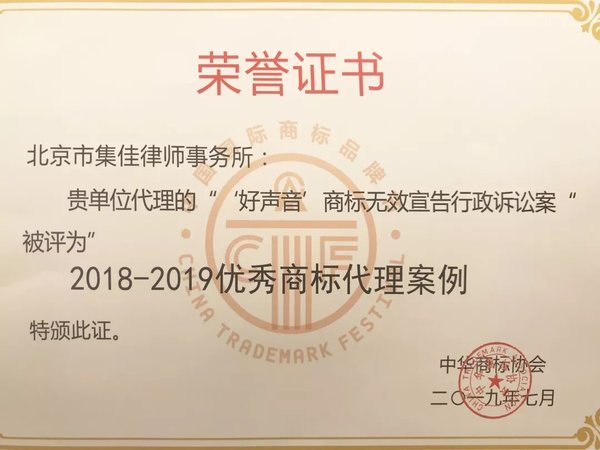 >178体育直播>关于我们>荣誉概览>2019>集佳代理“好声音”商标无效宣告行政案入选“优秀商标代理案例”