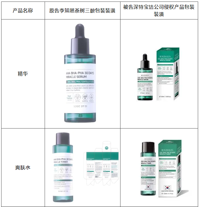 2021年原告委托178体育直播调查发现,被告汕头市深特宝洁实业有限公司生产、销售和推广的“茶树祛痘美白补水液”“茶树香皂”等护肤品,其产品包装装潢直接抄袭、摹仿原告前述已经具有较高知名度和影响力的“SOME BY MI/莎柏蜜”茶树三酸系列化妆品和黑蜗牛精华液的包装、装潢设计,使用与之近似的标识,造成消费者混淆误认。故原告作为茶树三酸、黑蜗牛精华包装装潢权益获益人,诉至广东省汕头市中级人民法院。汕头中院认定:李知恩主张的茶树三酸、黑蜗牛精华包装装潢构成具有一定影响的包装装潢,深特宝洁公司生产、销售茶树三酸、黑蜗牛精华液的行为构成不正当竞争。因判赔额不符合原告预期,原告后上诉至广东省高级人民法院,广东省高级人民法院最终维持一审判决。
