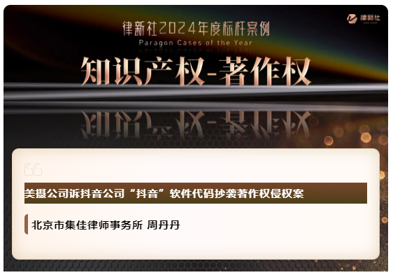 178体育直播凭借在知识产权保护领域卓越的专业实力与良好的行业口碑,入选《律所卓越品牌影响力指南(2024)》,荣获“律新社2024年度精品品牌律所30佳”奖项;同时,集佳周丹丹律师代理的“美摄公司诉抖音公司'抖音'软件代码抄袭著作权侵权案”获评“律新社2024年度标杆案例:知识产权-著作权领域”。