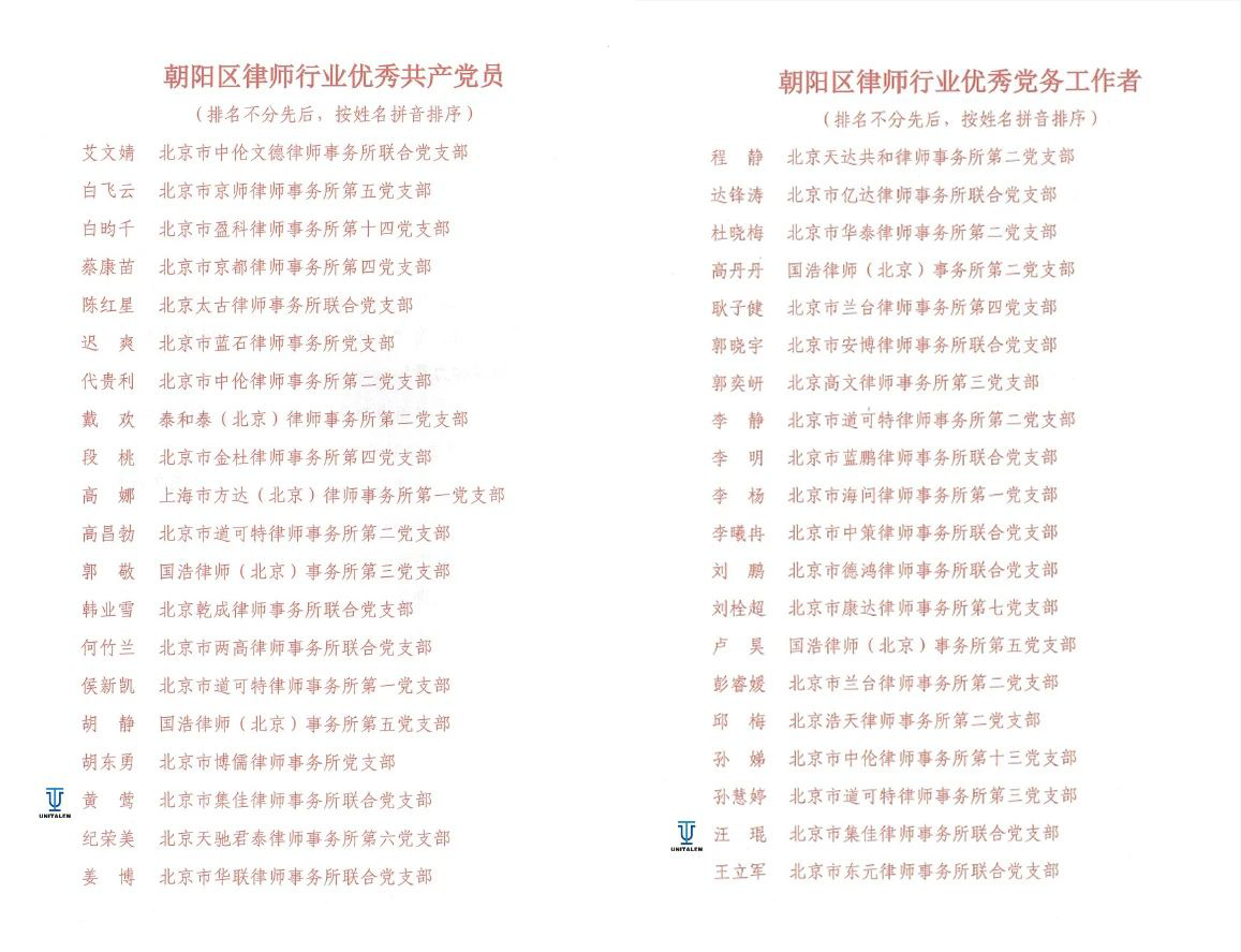 6月27日,朝阳区律师行业党委召开了朝阳区律师行业庆祝中国共产党成立104周年暨总结表彰大会,178体育直播联合党支部党员黄莺荣获“朝阳区律师行业优秀共产党员”称号,支部党员汪琨荣获“朝阳区律师行业优秀党务工作者”称号。
