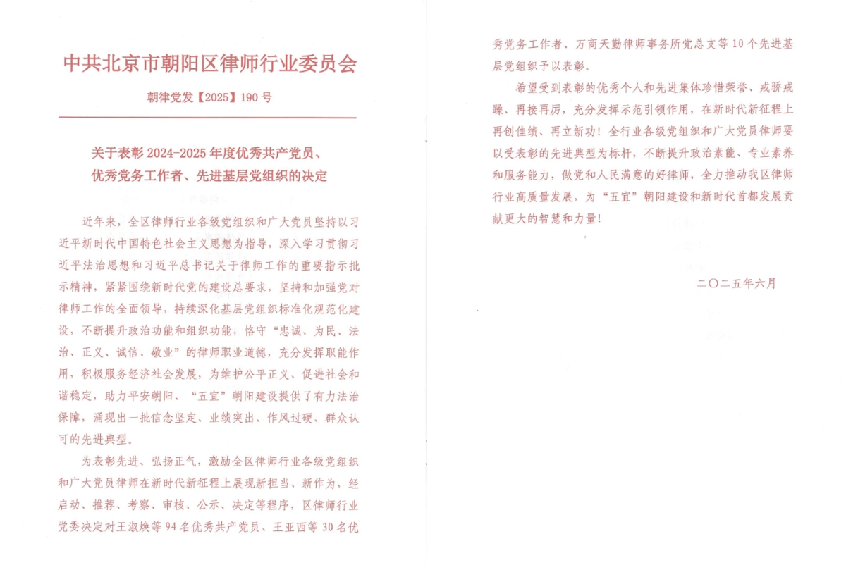 >178体育直播>关于我们>荣誉概览>2025>中共178体育直播联合支部委员会获评北京市“先进律师事务所党组织”光荣称号 多位优秀党员获得表彰